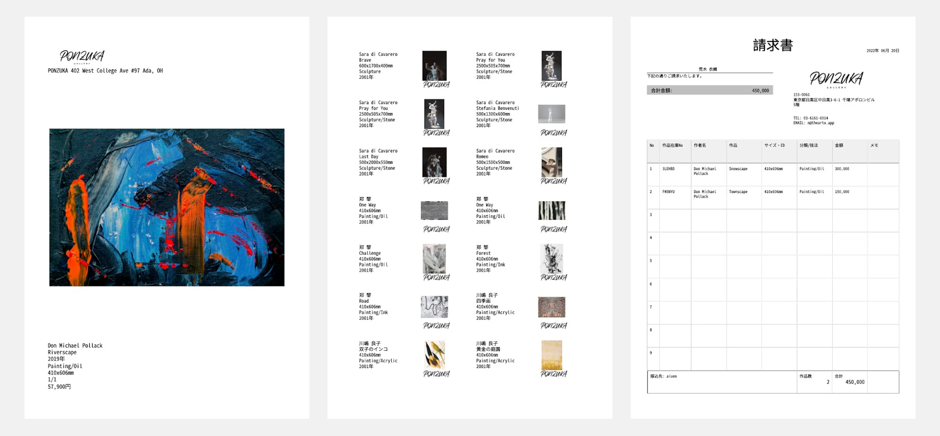 作品ラベルと宛先ラベルのほか、請求書等の伝票帳票や作品保証書をワンクリックで印刷できます。